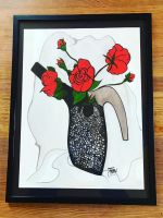 J’aime bien travailler en acrylique, encre, crayon et fusain. Je produit aussi quelques cartes, cartes postales et affiches. J’aime dessiner le modèle vivant et souvent mes tableaux sont colorés, créatives et excentriques!