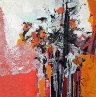 Le collage papier est depuis toujours ma principale technique. Le papier de récupération, de toute sorte, souple, travaillé, retravaillé avant la réalisation de l’œuvre. Mes empreintes, la gravure, les monotypes et le frottage se trouvent dans tous mes collages. Suite à cette préparation du papier, avec un thème en tête, je le déchire pour réaliser l’œuvre.