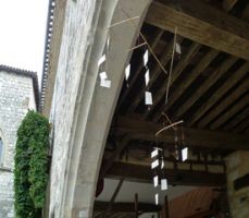 Depuis plus de quinze ans je conçois et fabrique des mobiles en écoutant mon inspiration, guidée par un lieu à «habiter», une intention, une commande particulière… Les mobiles qui prennent forme sont de toutes tailles mais gardent la même structure : des fils presque invisibles, des bois choisis, longtemps séchés et écorcés soigneusement, des objets suspendus..