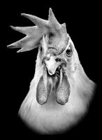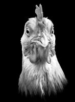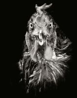 (vulgus gallinacea) photographiées de face à l'instar des portraits anthropométriques d'humains. Elles nous regardent, nous les regardons dans les yeux (ce qui est impossible puisque la poule a une vision monoculaire). Nous nous interrogeons réciproquement. Qui de la poule ou de l'homme ? Qui imite qui ? Une manière de résoudre cette antédiluvienne et fameuse question sur la poule et l'oeuf !"