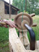 Réalisation de vaisselle en bois à l'aide d'un tour à perche, fabriqué maison, actionné par la force des mollets, ne nécessitant pas d'électricité.